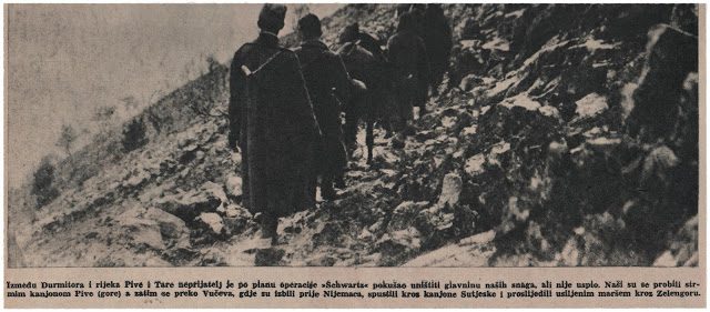 Prelazimo s grupom boraca Bistricu. Zauzeli smo položaj u jednom tunelu odakle štitimo prijelaz Tita i članova Vrhovnog štaba na lijevu obalu rijeke. Čitav nas dan napadaju njemački tenkovi.